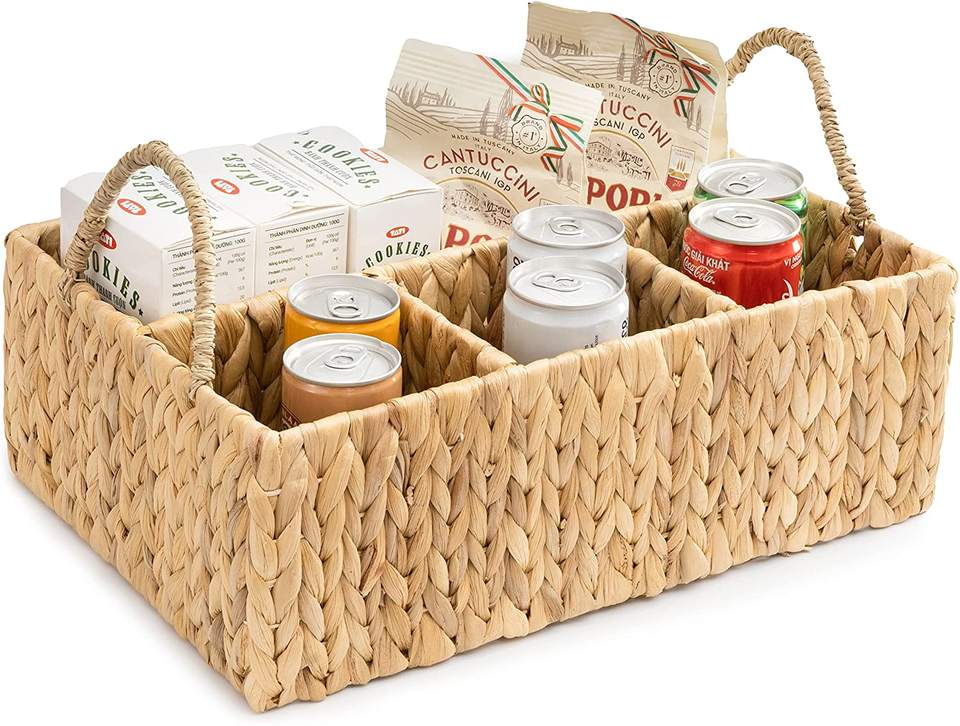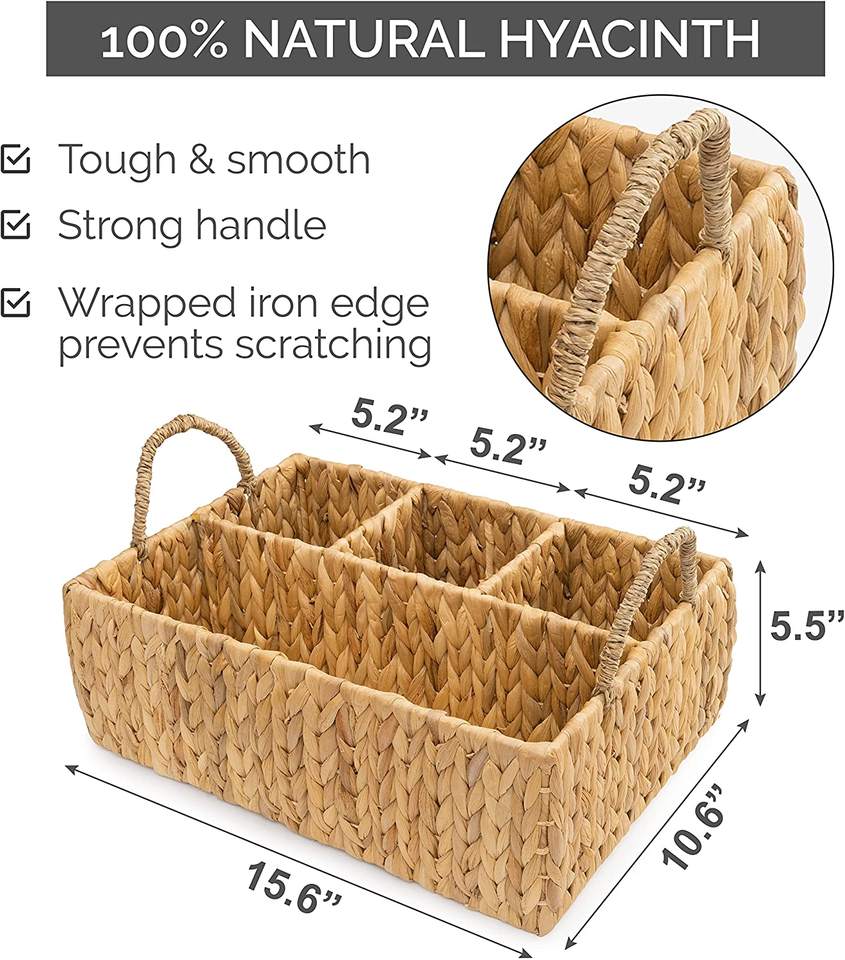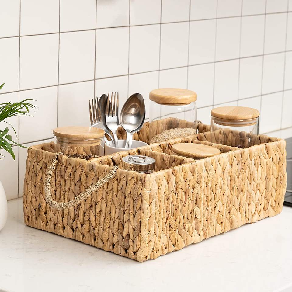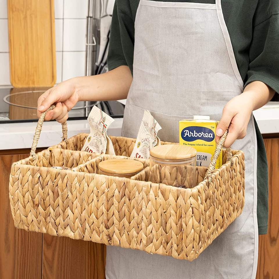 Natural Kitchen Rectangle Water Hyacinth Storage Basket With Dividers Woven Seagrass Utensil Holder with Handles for Organizing