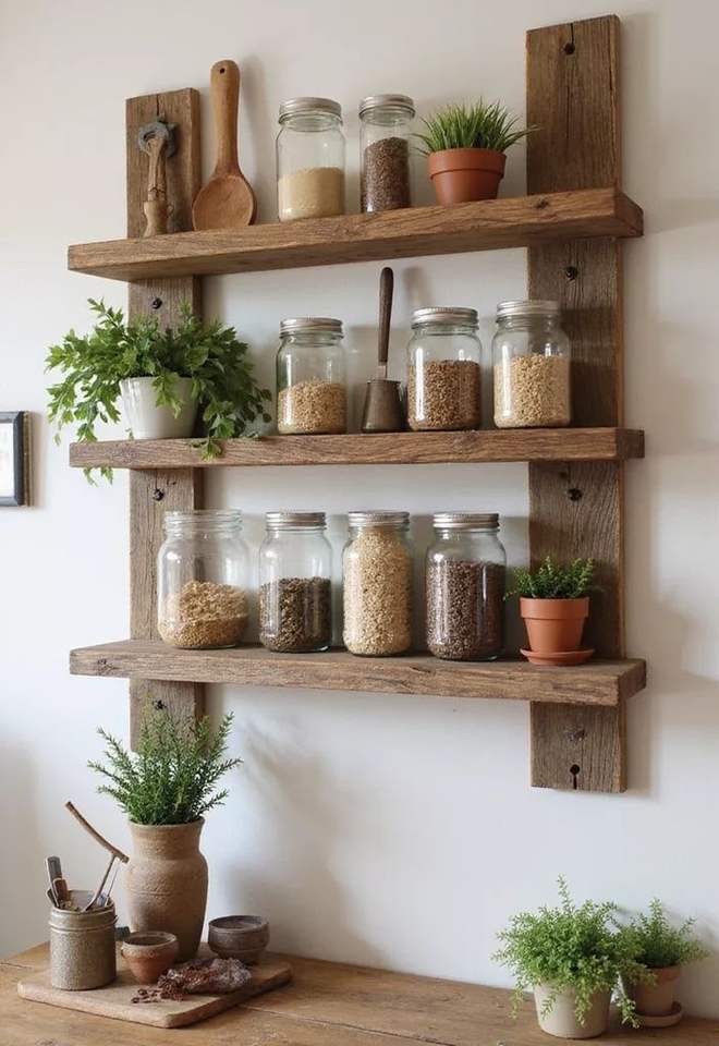 Natural Kitchen Spice Rack with Glass Jars Wooden Shelving Iron Frame and Resin Accents for Stylish Organized Storage