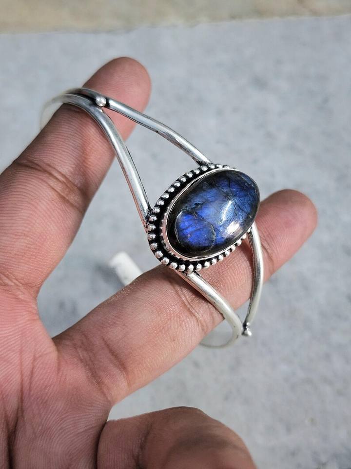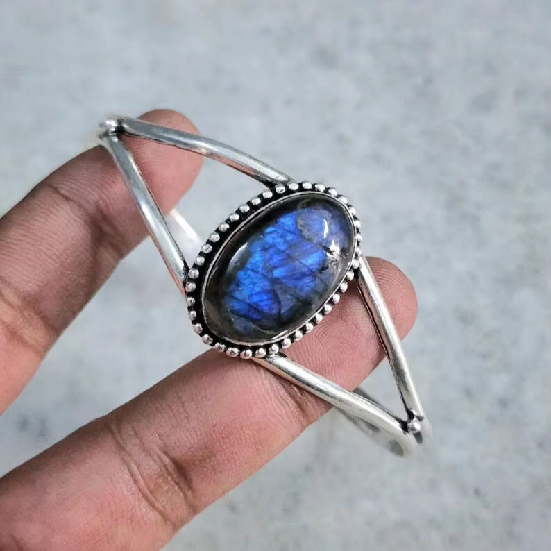 Handmade 925 Sterling Silver Adjustable Cuff Bangle Natural Labradorite Gemstone Boho Style Bangles for Women