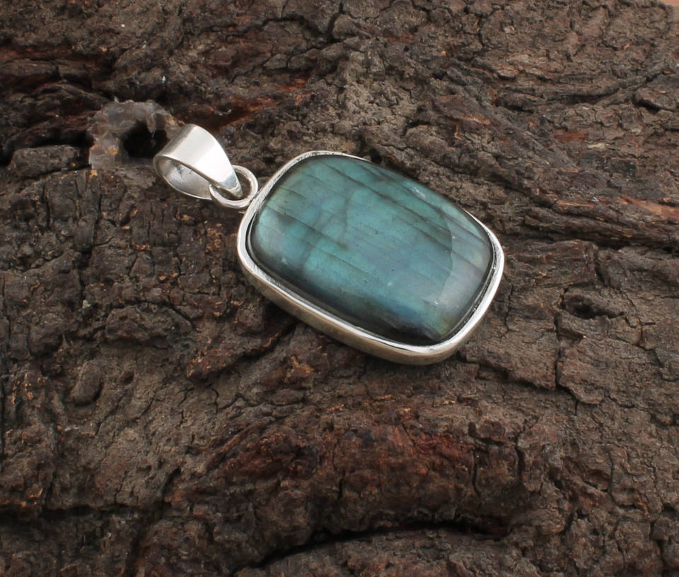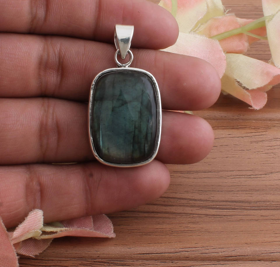 Natural Labradorite Pendant 925 Sterling Silver Platinum Plated Bezel Setting Blue Flash Gemstone Necklace Vintage Handmade