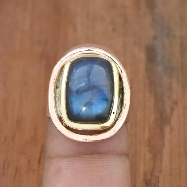 Natural Labradorite Ring 925 Sterling Silver Wide Band Two Tone Bohemian Jewelry Handmade Gemstone Hammered Anniversary Ring