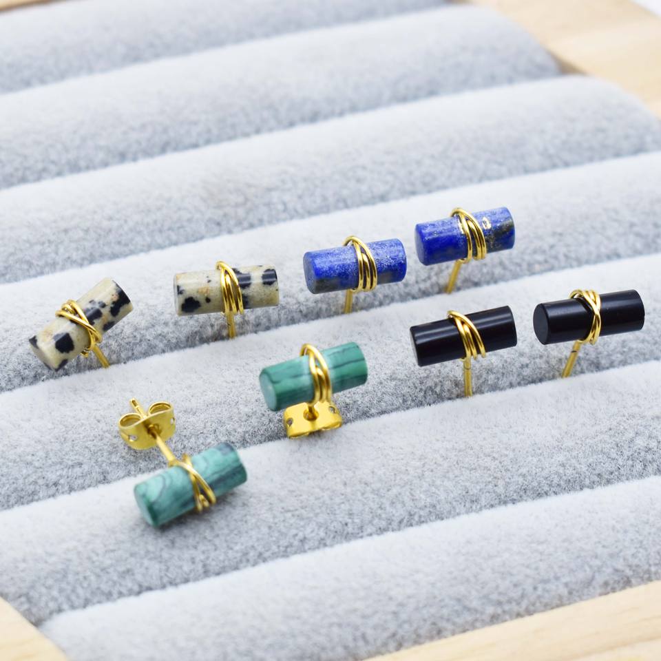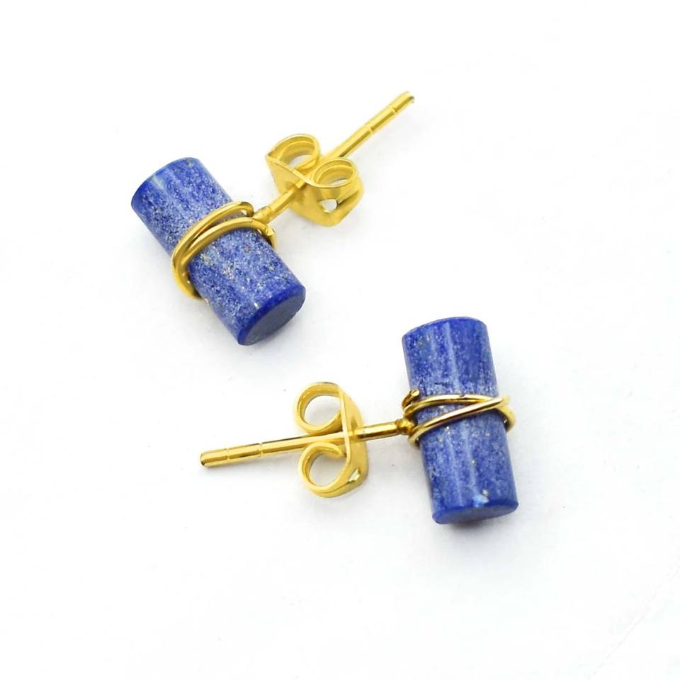 Natural Lapis Lazuli Tube Stud Earring Gold Plated Wire Wrapped Gemstone Stud Earring, Valentine Gift jewelry