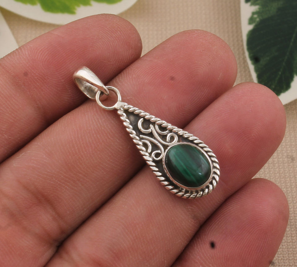 Vintage Natural Malachite Pendant 925 Sterling Silver Platinum Plated Genuine Green Banded Necklace Silver Stone Jewelry