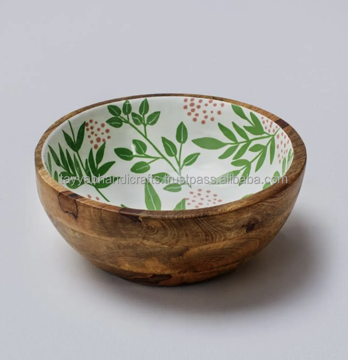 Natural Mango Wood Bowls Food Grade Wooden Decorative Serving Bowls with Inlay Print for Snack & Dry Fruits