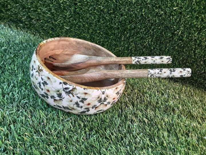 Natural Mango Wood Enamel Printed Salad Serving Bowl for Serving Delicious