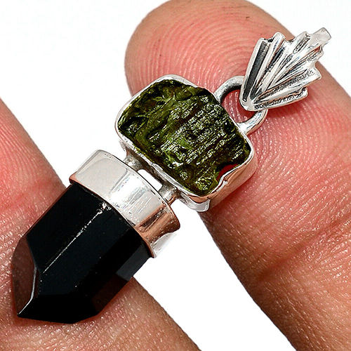 Natural Moldavite Rough Gemstone Silver Pendant for Women Black Tourmaline Crystal Point Gemstone 925 Sterling Silver Pendant