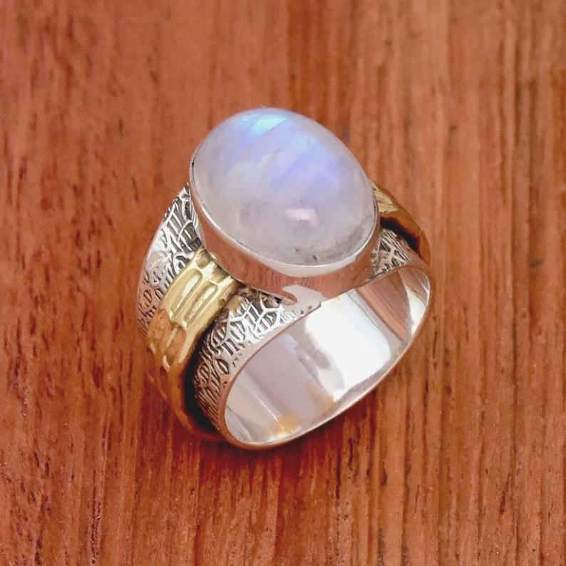 Natural Moonstone Ring 925 Sterling Silver Wide Textured Band Bohemian Statement Ring
