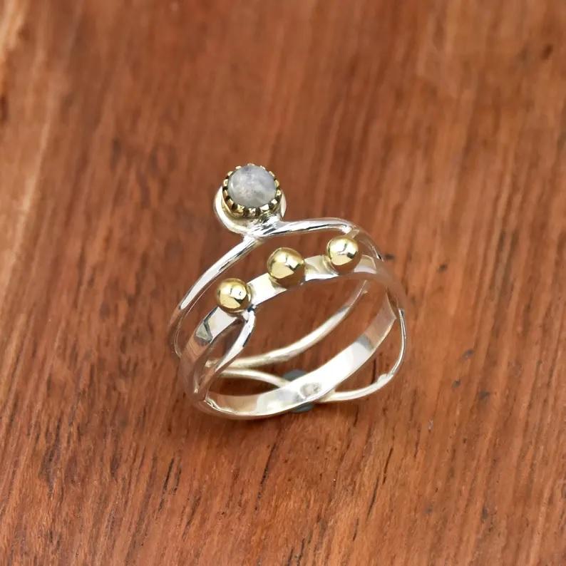 Natural Moonstone Ring Sterling Silver Round Stone Beaded Wire Wrap Band Ring