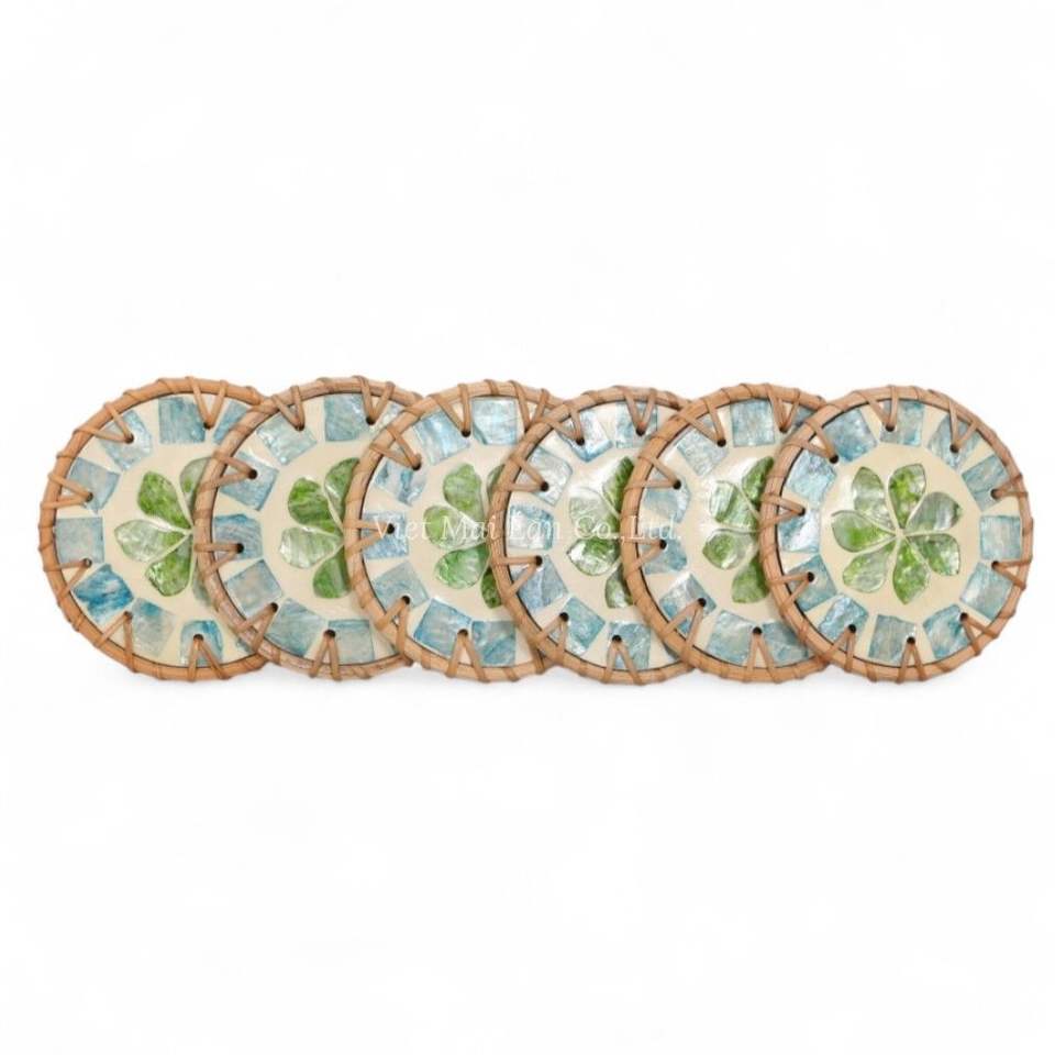 Natural Mother of Pearl Drink Coaster with Woven Rattan Edge for Home Table Styling Gifts and Eco Friendly Use