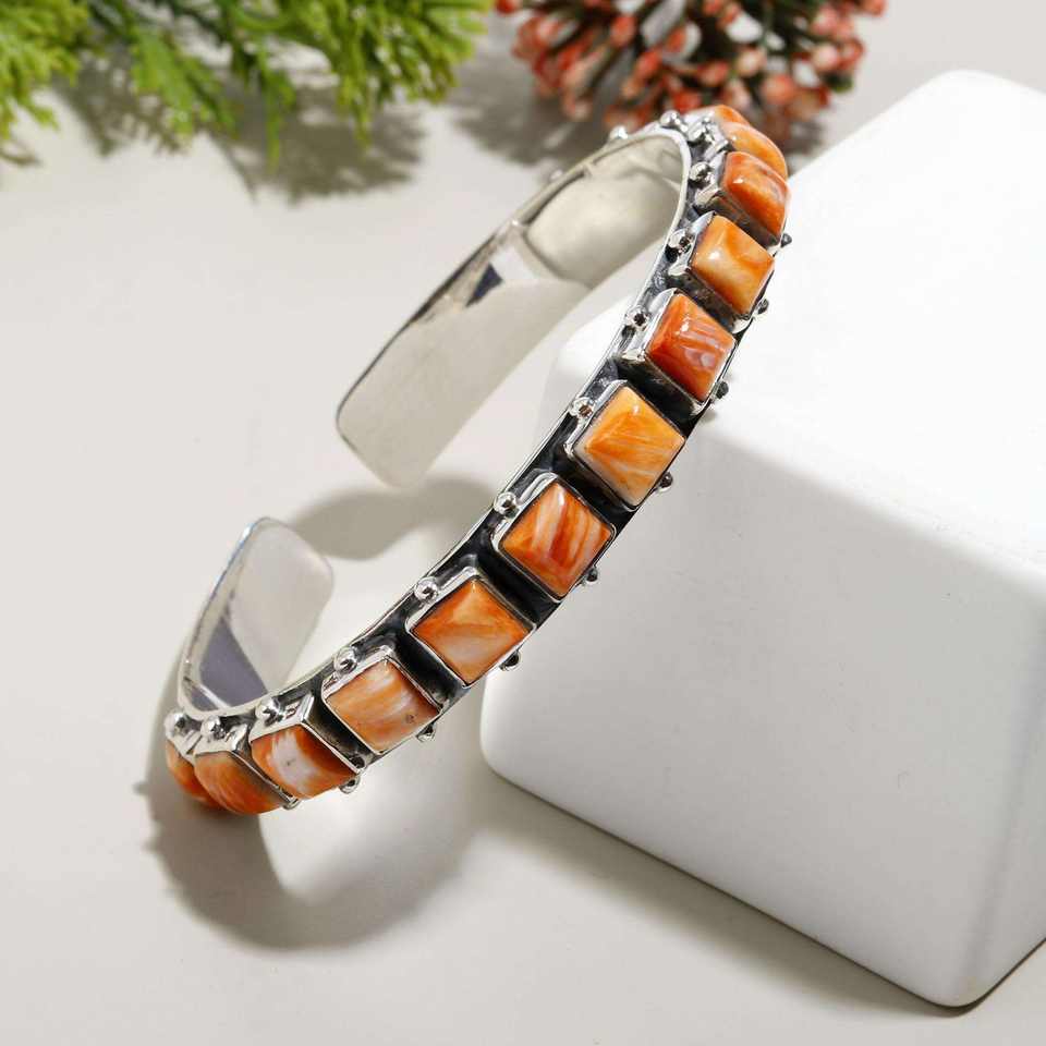 Natural Orange Oyster Gemstone Wonderful 925 Solid Sterling Silver Natural Gemstone Bangle Handmade Mexican Navajo Jewelry