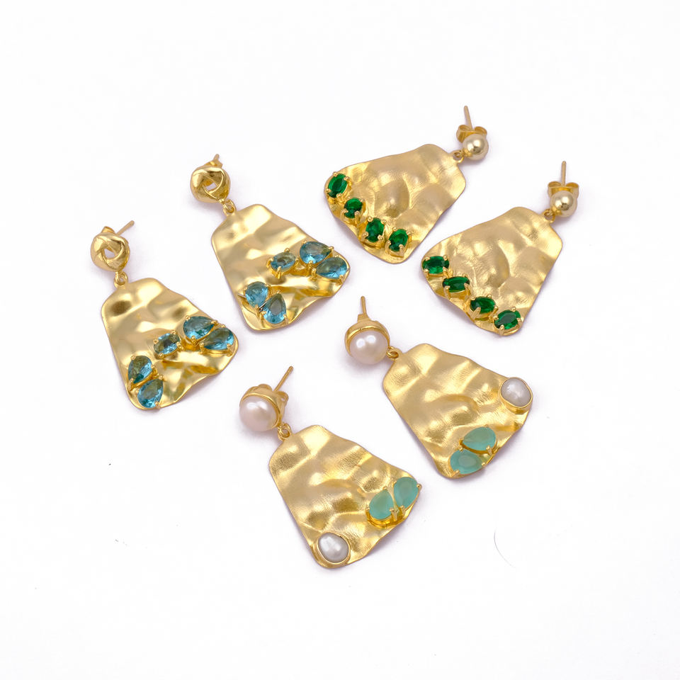 Natural Pearl Aqua Chalcedony Stud Earrings Gold-Plated Brass Hammered Design Prong Bezel Trendy Gemstone Birthstone Jewelry