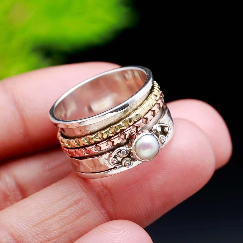 Natural Pearl Hammered Sterling Silver Solid 925 Spinner Handmade Three Tone Silver Band Fidget Ring Boho Style Statement Ring
