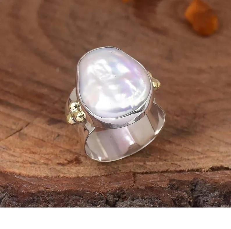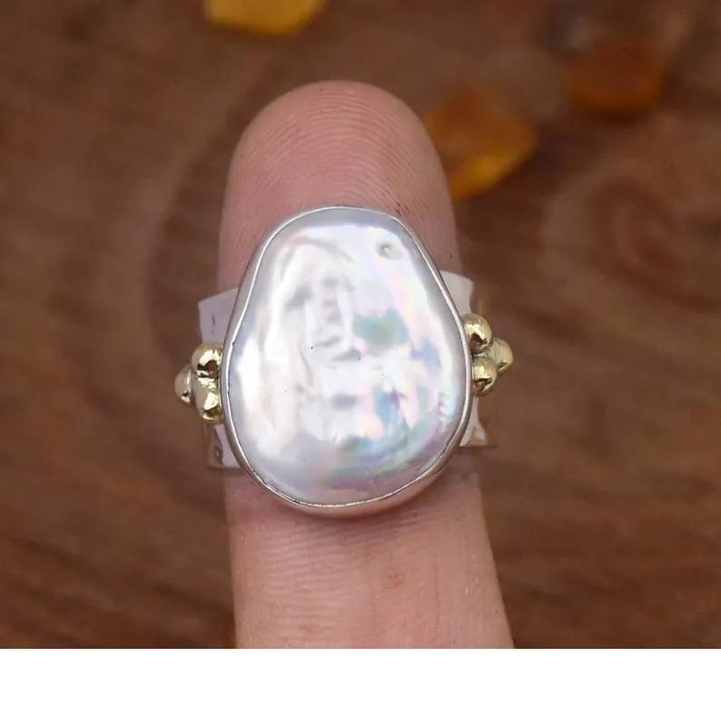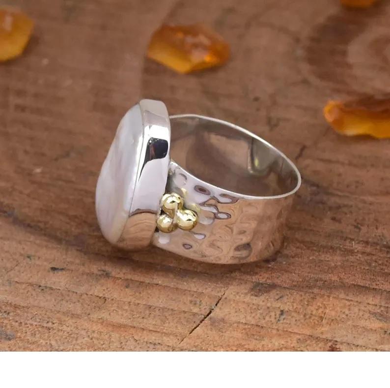 Natural Pearl Ring 925 Sterling Silver Wide Band Hammered Beaded Bohemian Statement Ring Gift for Her