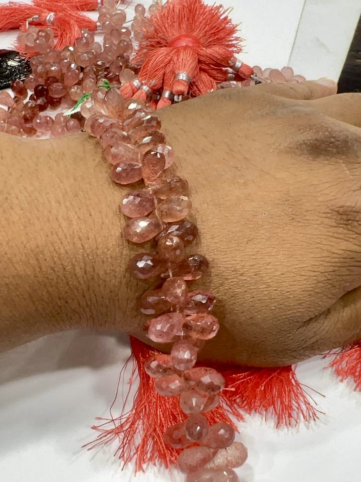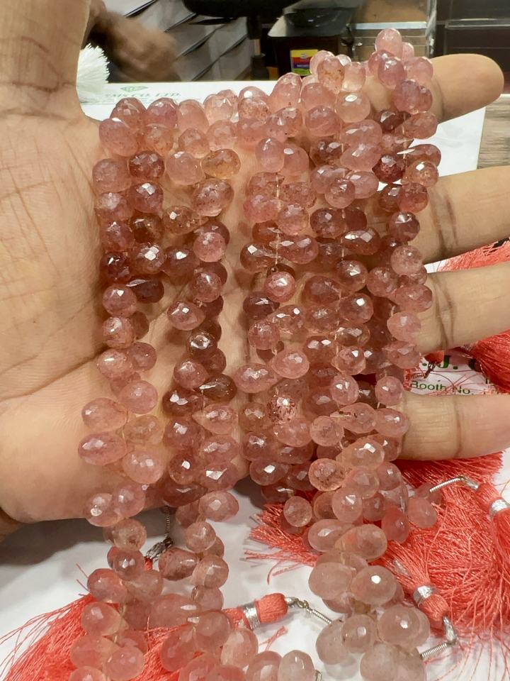 Natural Pink Strawberry Quartz Faceted Briolette Teardrops 8 Inch Strand Size 5-7mm Approx Cushion Cut Gemstone Loose Gemstones