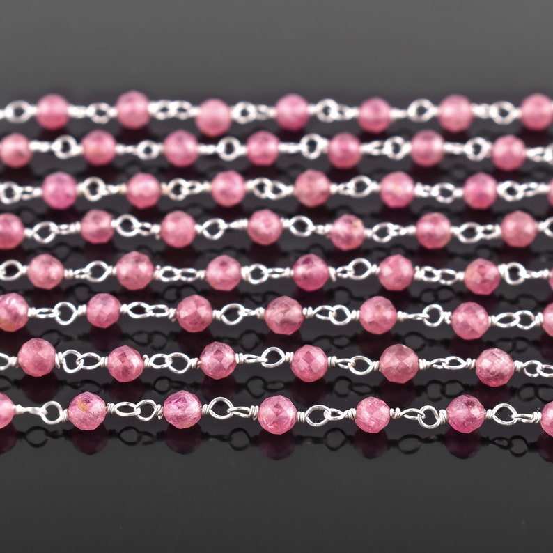 Natural Pink Tourmaline Micro Faceted Round Beads Rosary Chain 3mm Tourmaline Stone 925 Sterling Silver Wire Wrapped Link Chain