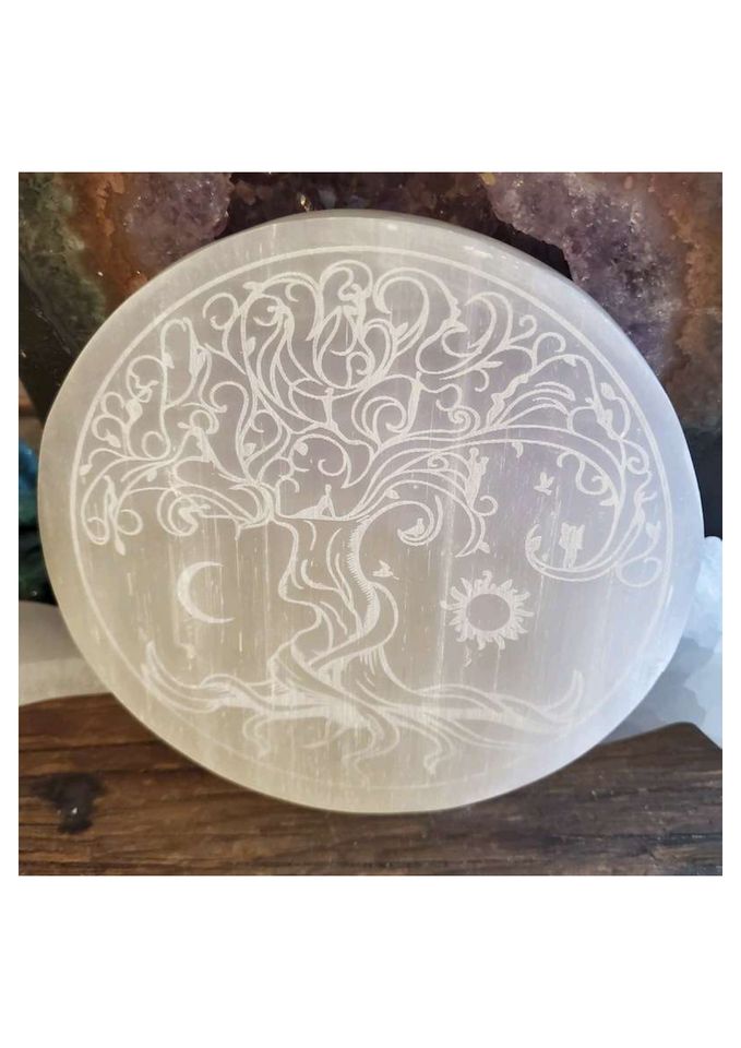 Natural Polished Selenite Charging Plate Round Tree Life Engraving Crystal Cleansing Disc Reiki Meditation Portable Home Decor