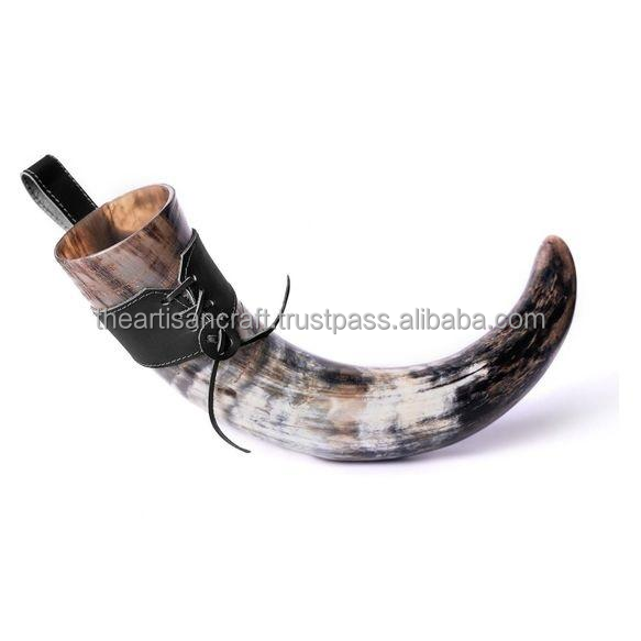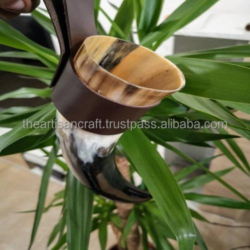 Natural Polished and Carved Buffalo Horn Drinking Horn with Leather Holder Tea and Christmas Decoration in Angel Style