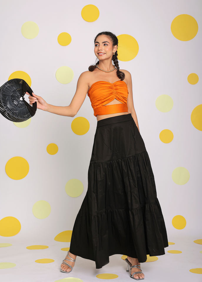 Natural Pure Cotton Co-ord Set Orange Black Fitted Burst Western Top Skirt Elastic Waist Band Button Available Big Sizes