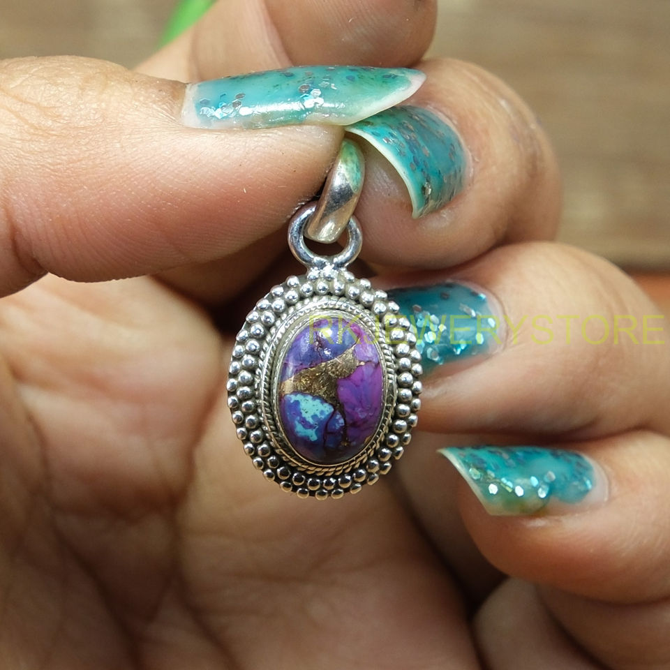 Natural Purple Copper Turquoise Oval Cabochon 925 Sterling Silver Handmade Beaded Frame Pendant Boho Vintage Tribal Jewelry