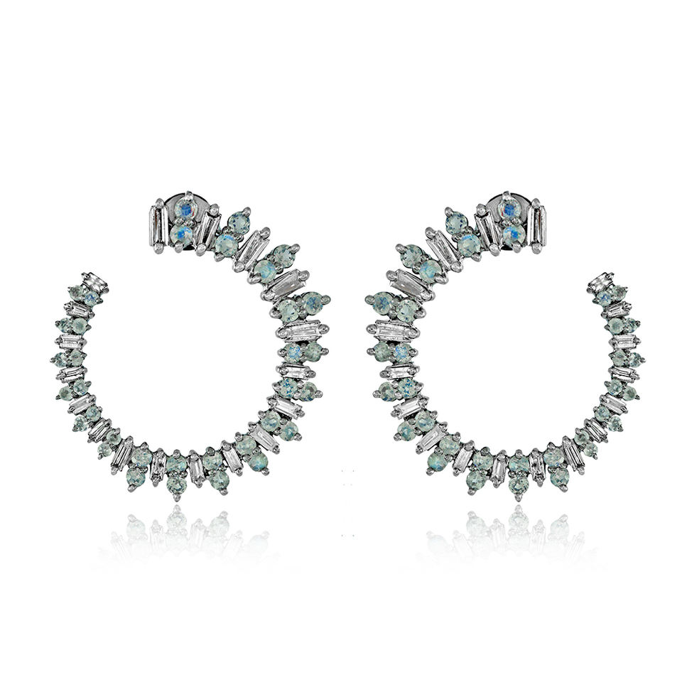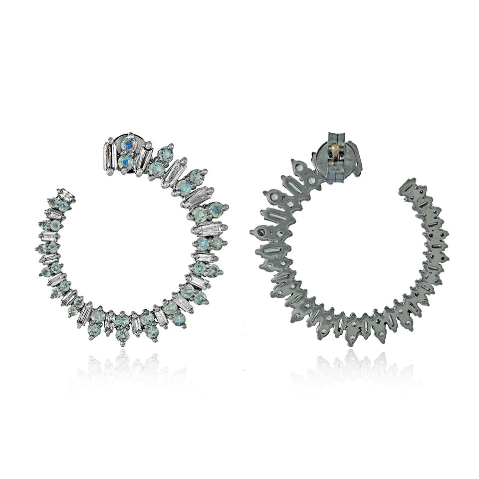 Natural Rainbow Moon Stone 30 MM Hoop Baguette Diamond Earrings Oxidized 925 Silver 14K Gold Handmade Jewelry