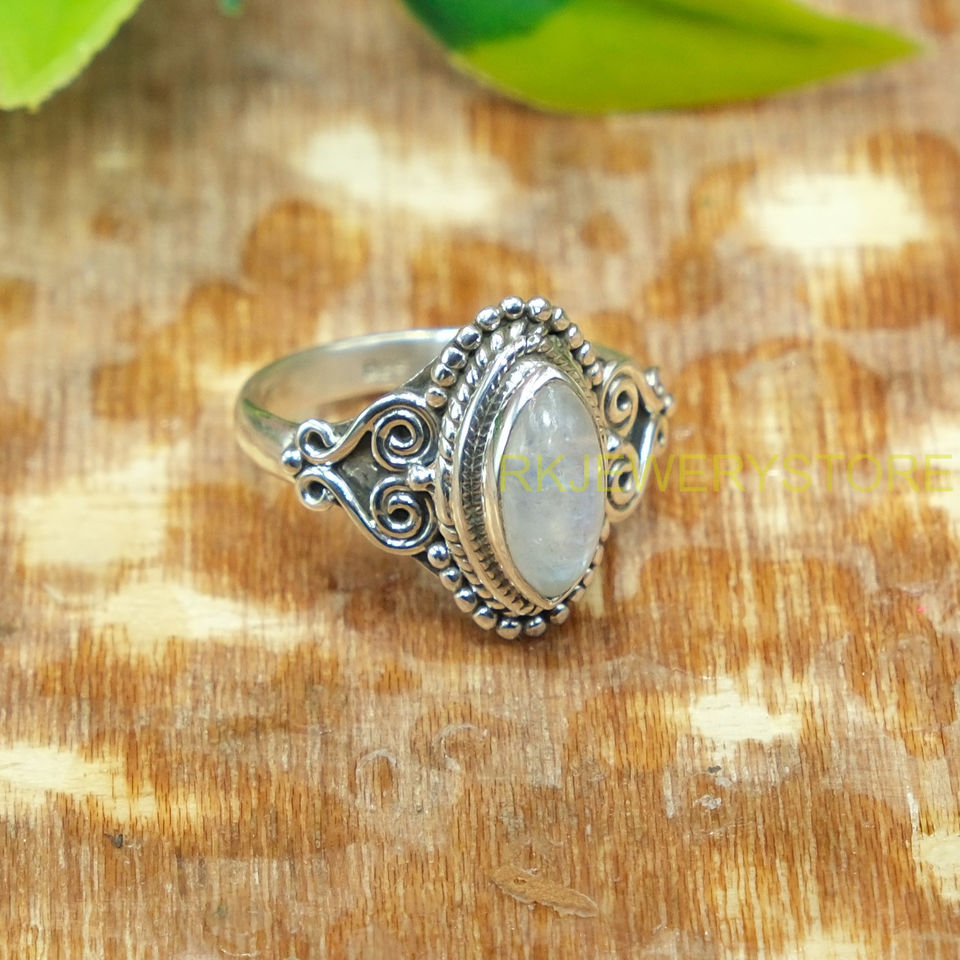 Natural Rainbow Moonstone Gemstone 925 Sterling Silver Handmade Vintage Filigree Statement Ring for Women Cabochon White Stone