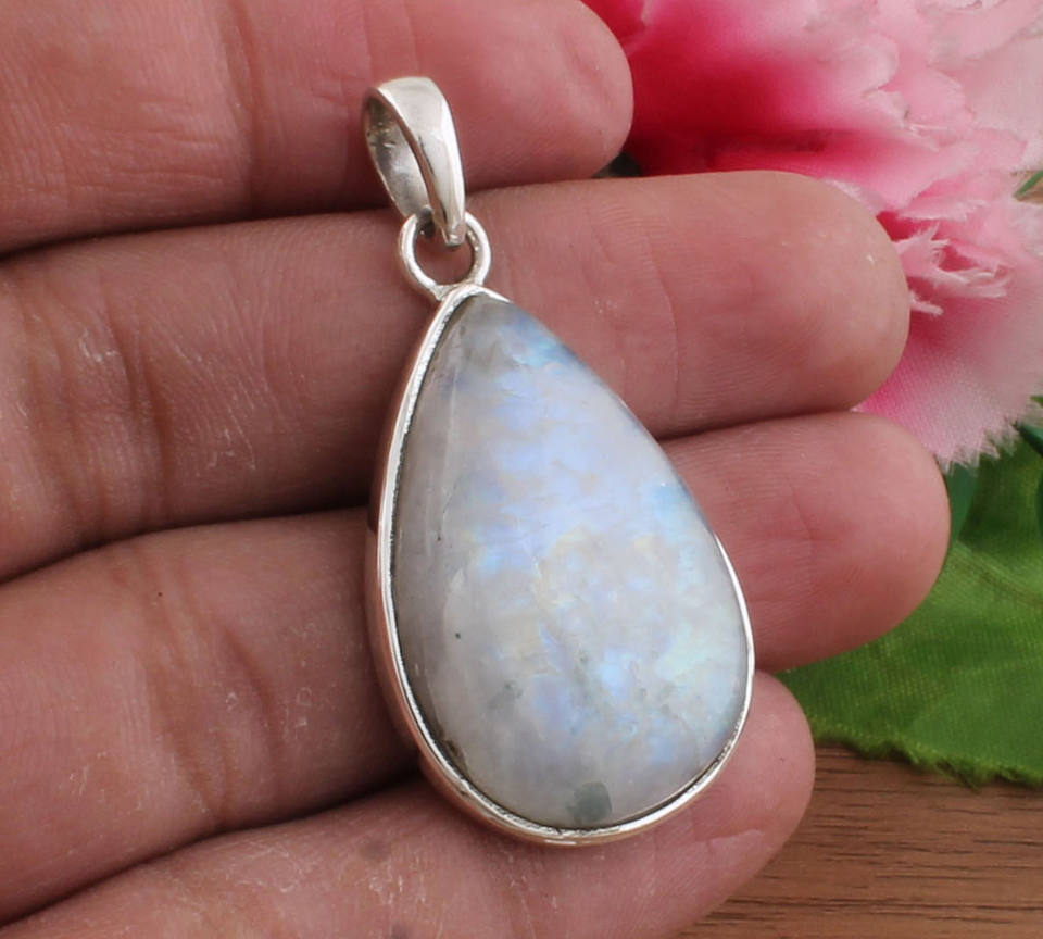 Natural Rainbow Moonstone Pendant 925 Sterling Silver Platinum Plated Vintage Bezel Setting Genuine Blue Flash Gemstone Necklace