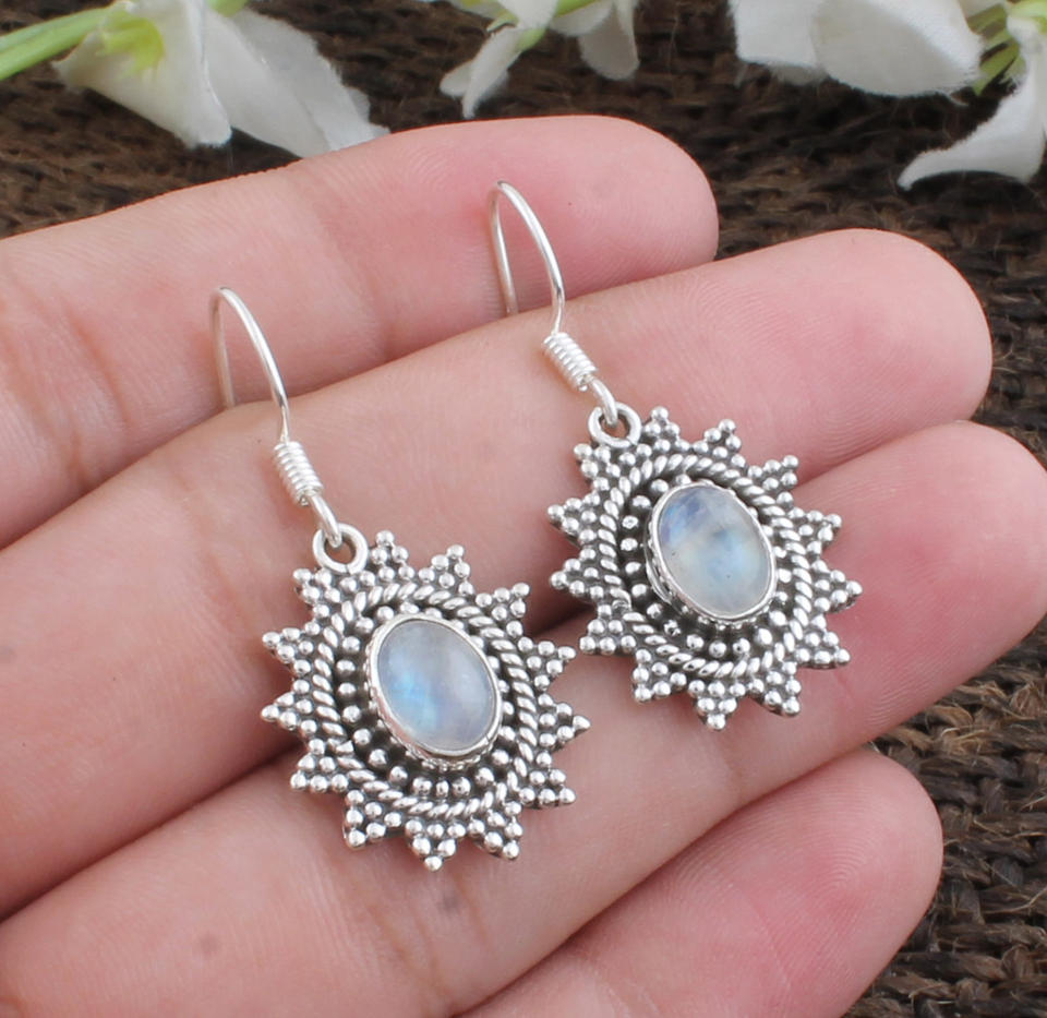 Natural Rainbow Moonstone Solid 925 Sterling Silver Handmade Vintage Drop Earrings for Wedding Anniversary Gift Party