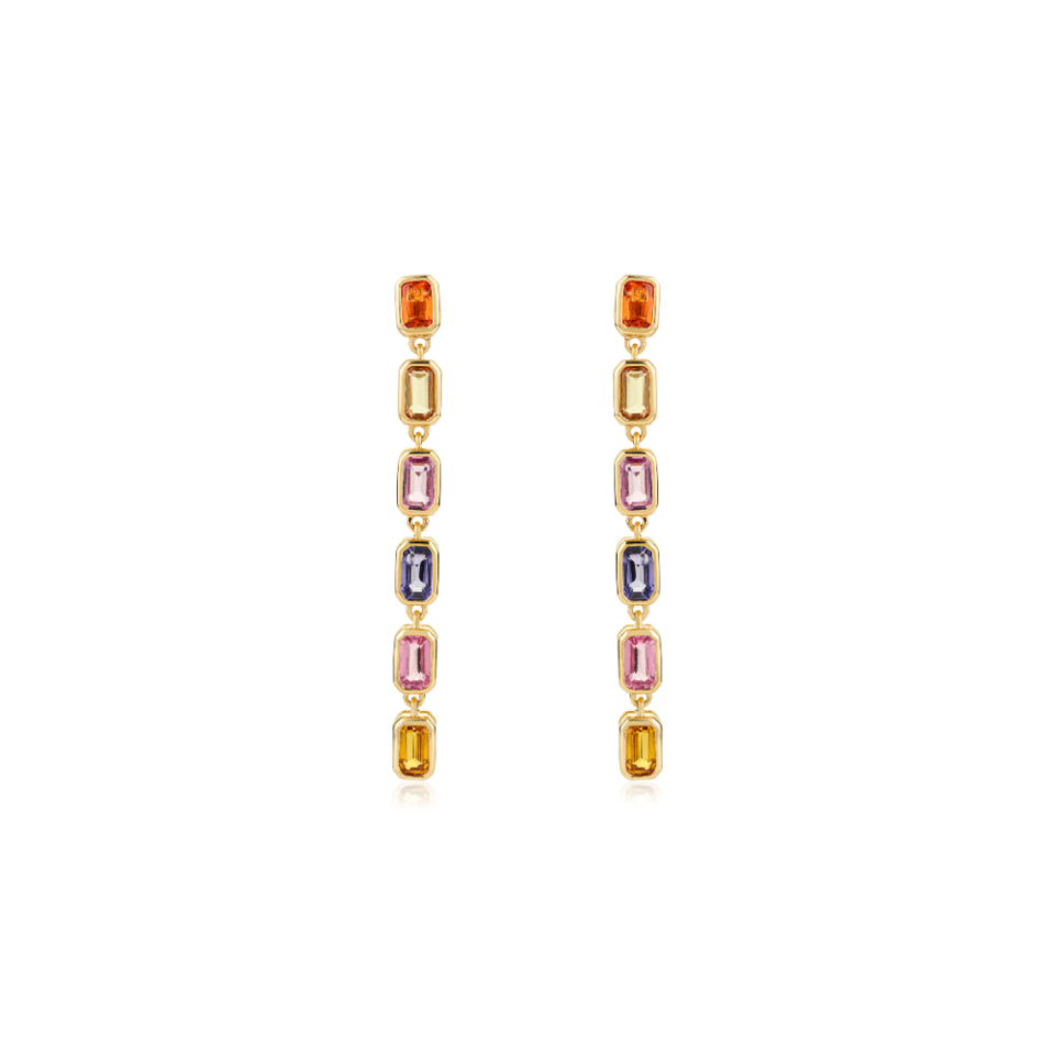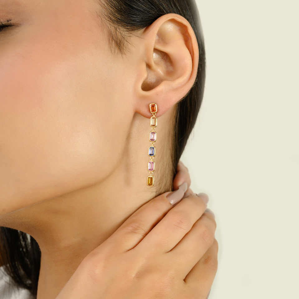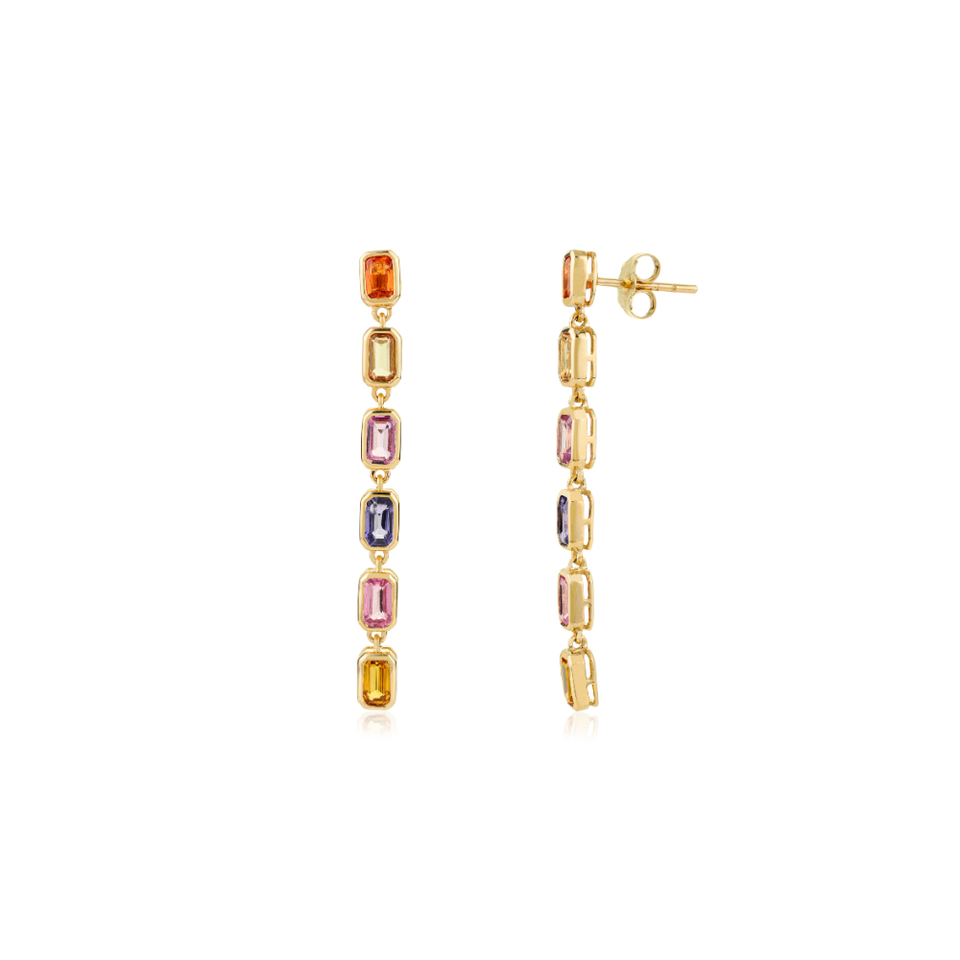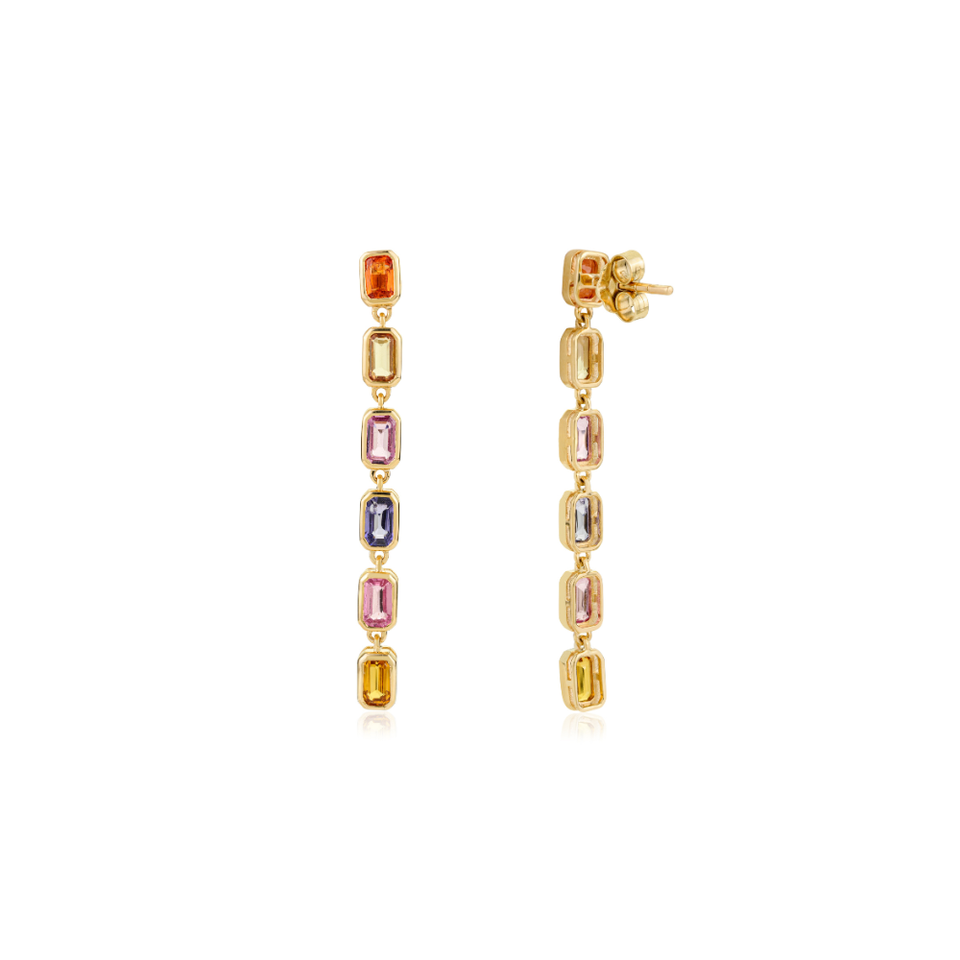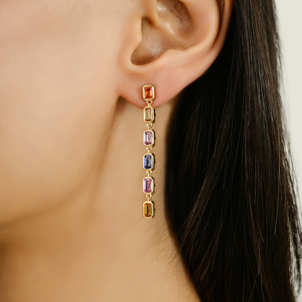 Natural Rainbow Multi Sapphire 14K Yellow Gold Octagon Cut Gemstone Long Dangling Earrings Statement Women Jewelry For Wedding