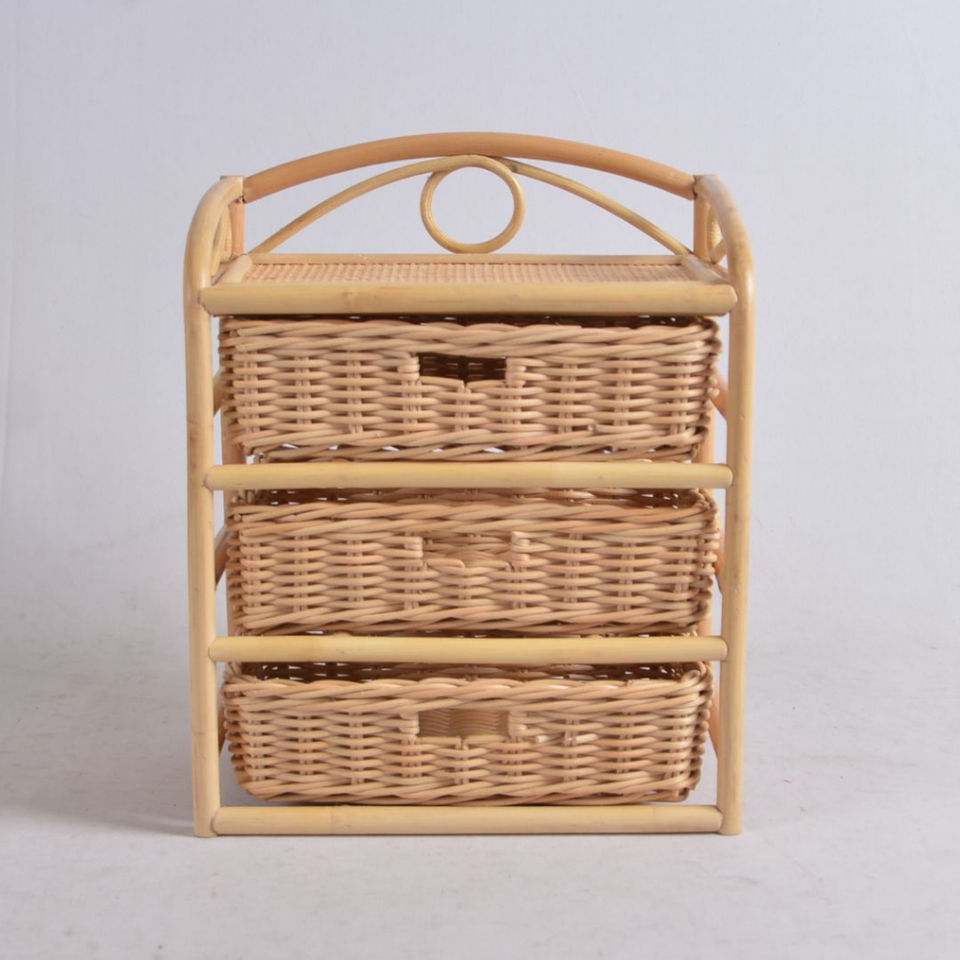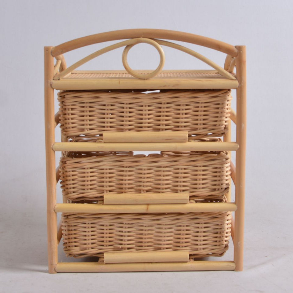 Natural Rattan 3-Tier Wicker Storage Basket Organizer With Wooden Frame Handmade Decorative Shelf