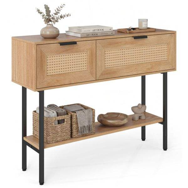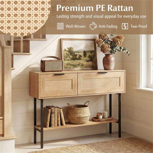 Natural Rattan Console Table with Open Shelf Storage Cabinets 40-Inch Sturdy Carbon Steel Frame for Entryway or Living Room