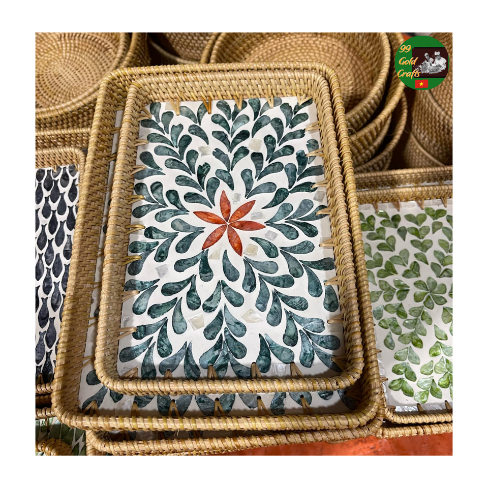 Natural Rattan Mosaic Tray Mixed Mother of Pearl Handmade Serving Tray for Hotel Restaurant Use, Tea Coffee and Food Serving