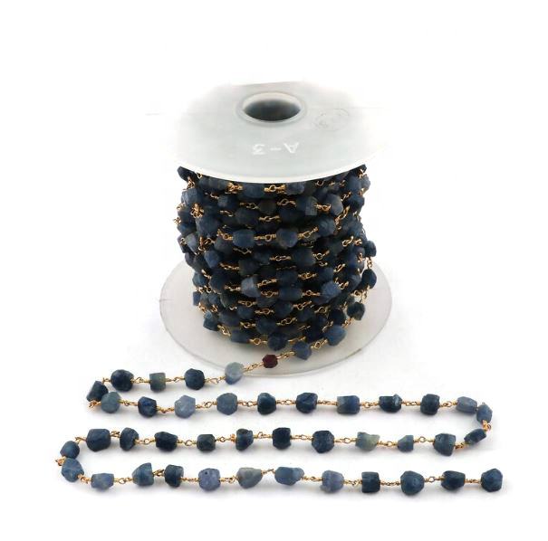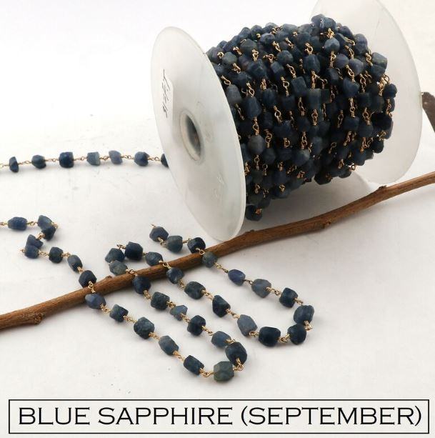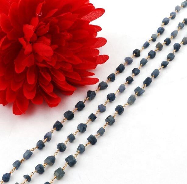 Natural Raw Sapphire Handmade Wire Wrapped Gold Plated Rosery Chain Size8-10mm Birthstone Beaded Chain Blue Gemstone Metal Chain