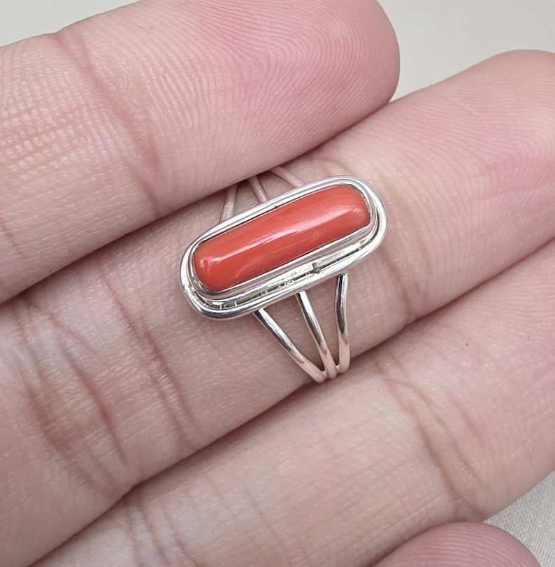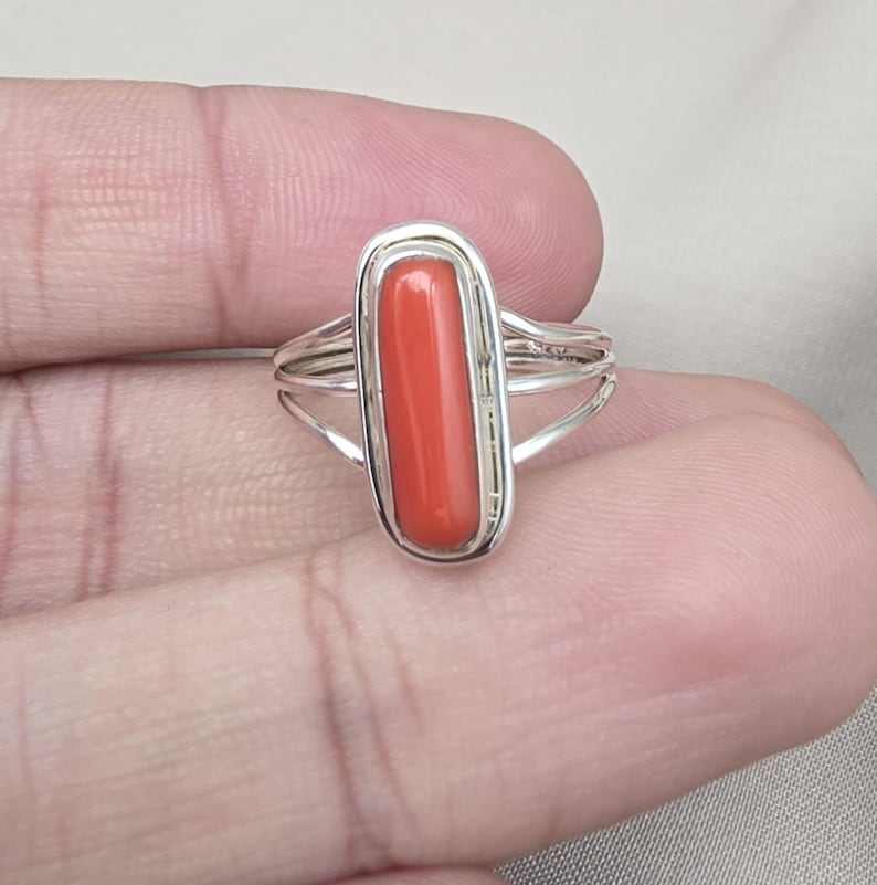 Natural Red Coral Ring Long Oval Cabochon, 925 Sterling Silver Perfect For Women Gift