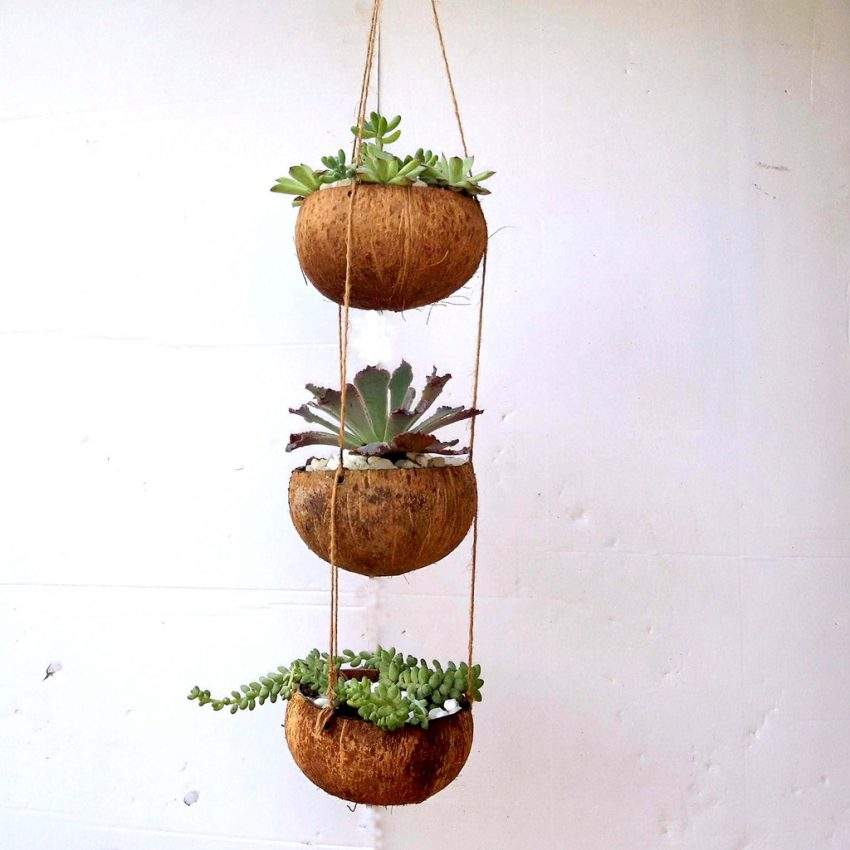 Natural Reusable Biodegradable Coconut Shell Flower Plant Pot Holder With Cotton Rope Coconut for Home Garden Decoration