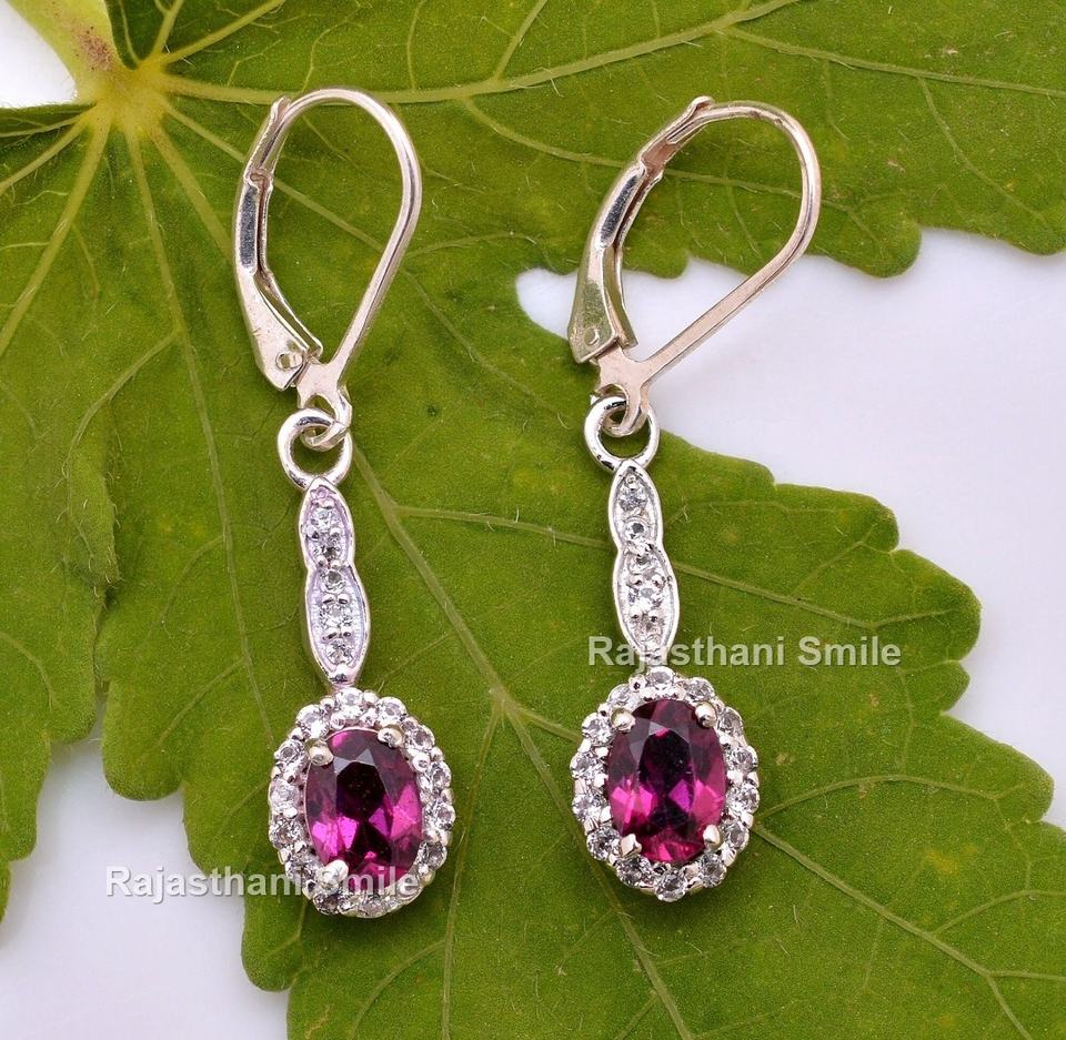Natural Rhodolite Garnet and CZ 925 sterling silver oval cut gemstone halo lever back drop earrings 7x5 mm stone size