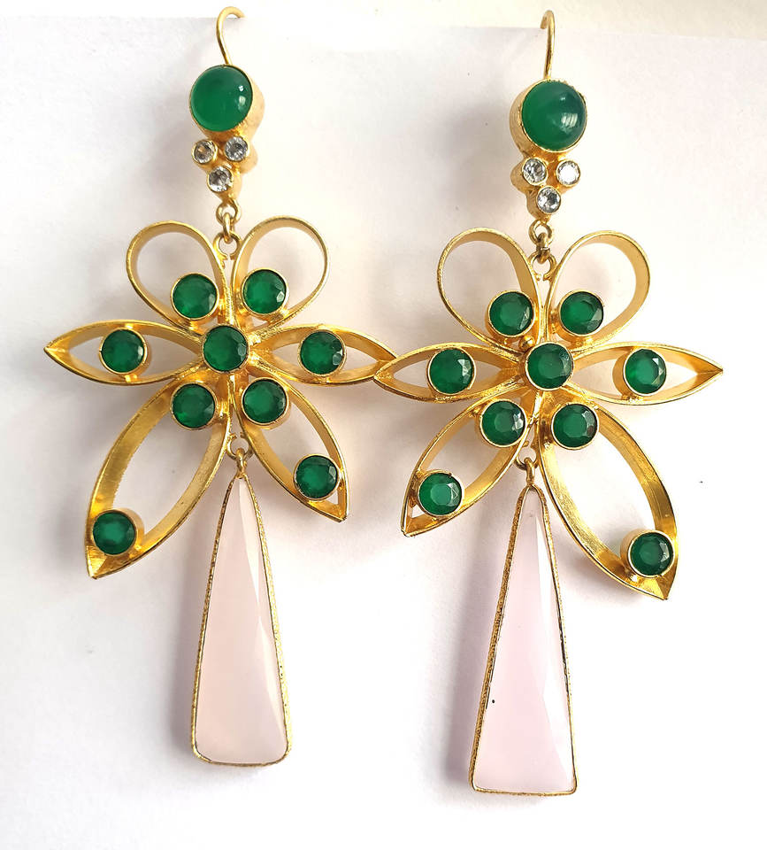 Natural Rose Chalcedony Green Onyx Flower Gold Plated Stud Dangle Earring Indian Wholesaler of Semi-Precious Stone Drop Earrings