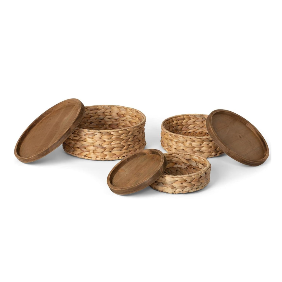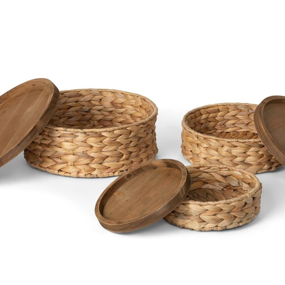 Natural Round Water Hyacinth Storage Basket with Wood Lid for Plate Storage Cheap Price Wholesale Kitchen Item From Vietnam
