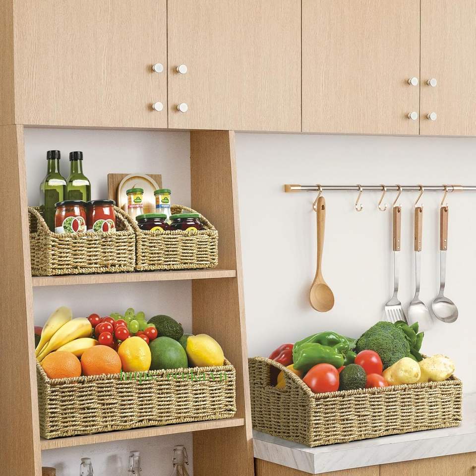 Natural Seagrass Storage Baskets, Handwoven Wicker Storage Bins with Built-in Handles, Storage Container Baskets for Shelves