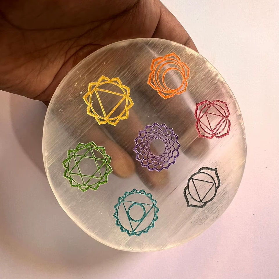 Natural Selenite Chakra Engraved Plate Crystal Charging Board Round Selenite Slab Reiki Healing Meditation Wholesale Bulk