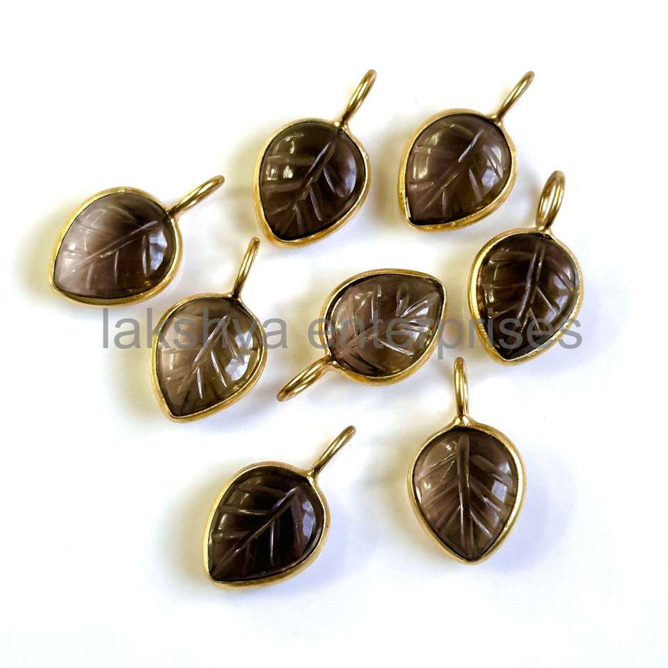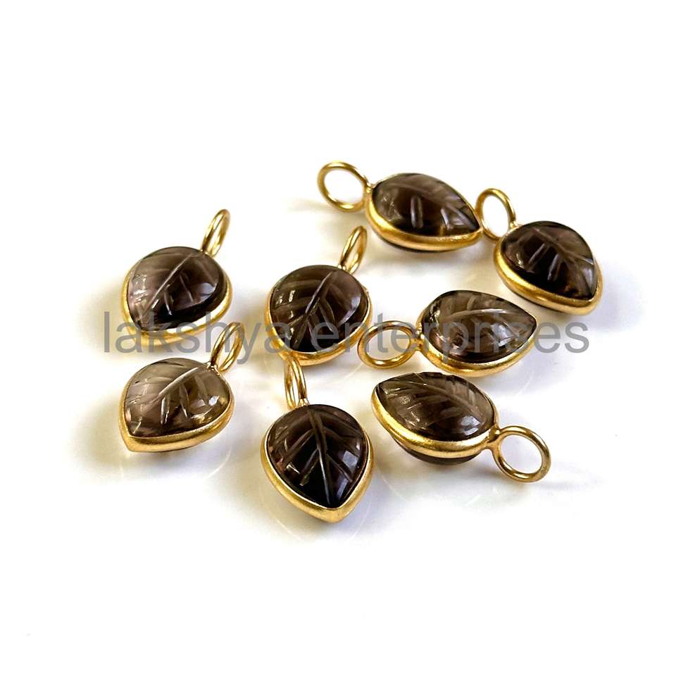 Natural Smoky Quartz Stone Leaf Carving 925 Sterling Silver Charms 10x8mm Gold Vermeil Bezel Setting Carved Gemstone Pendants