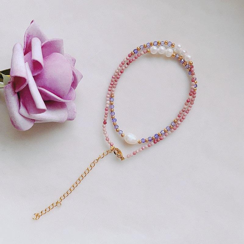Natural Stone Baroque Pearl Necklace Versatile Titanium Steel Purple Crystal Rosestone Color Contrasting Lock Fashion Beaded