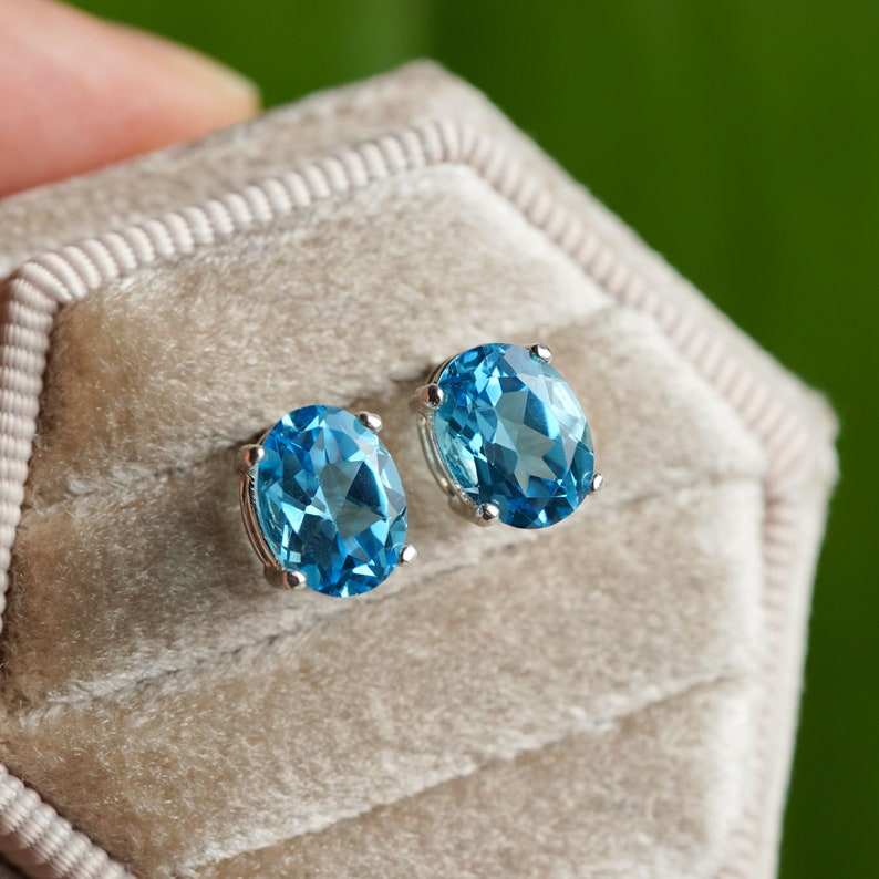 Natural Swiss Blue Topaz 8X6Mm Oval Stud Earrings 925 Sterling Silver Gemstone Jewelry Gift Boxed Elegant Women