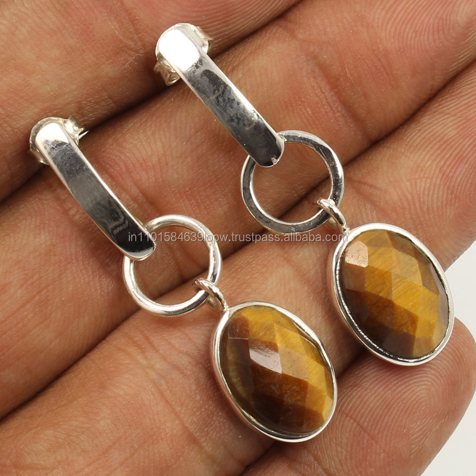 Natural Tiger's Eye Gemstones Unique Collection Bezel Set Earrings Pure 925 Solid Sterling Silver New Faishonable Jewelry