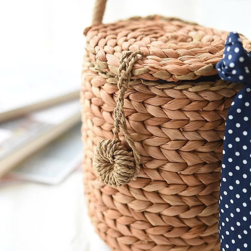 Natural Water Hyacinth Cylindrical Straw Beach Bag With Polka Dot Bow Handmade Summer Tote