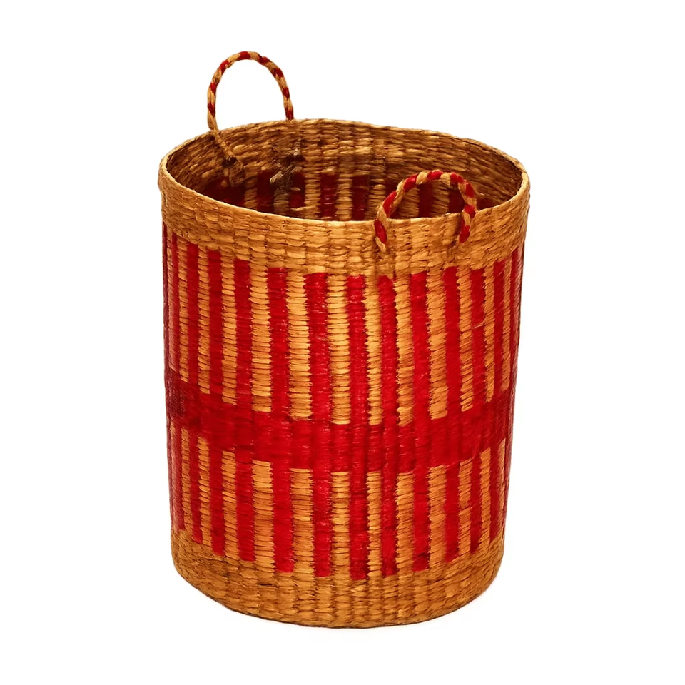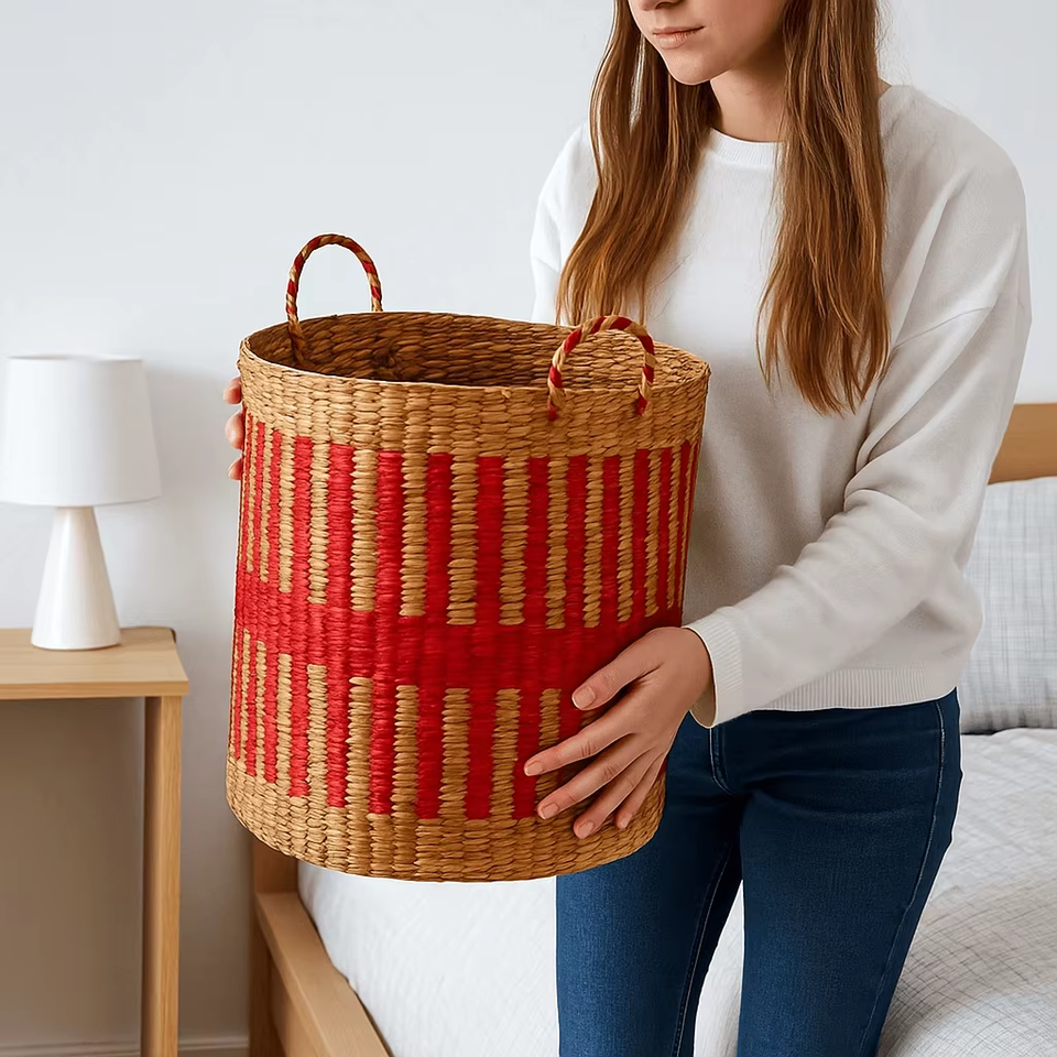 Natural Water Hyacinth Handcrafted Wicker Laundry Basket With Scarlet Stripe Design | Eco Friendly Household Storage Basket