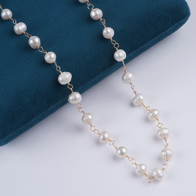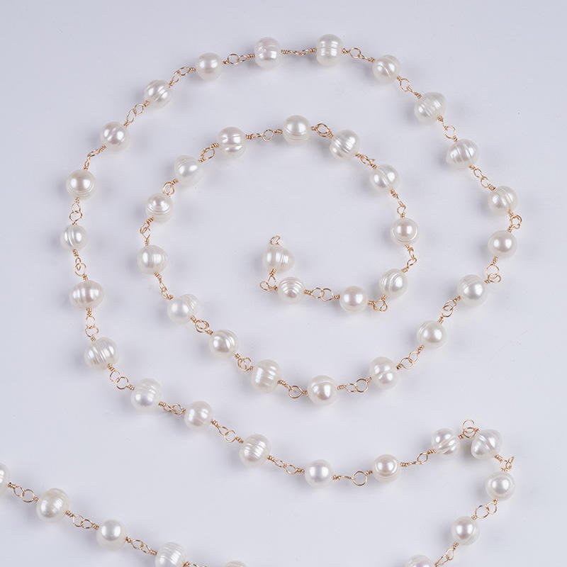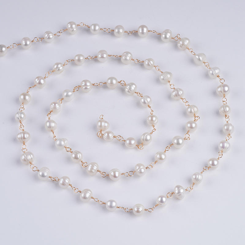 Natural White 9-10/10-11mm Freshwater Pearl Wrapped Bead Chain Semi-Finished DIY Necklace with Loose Pink Colored Pearls