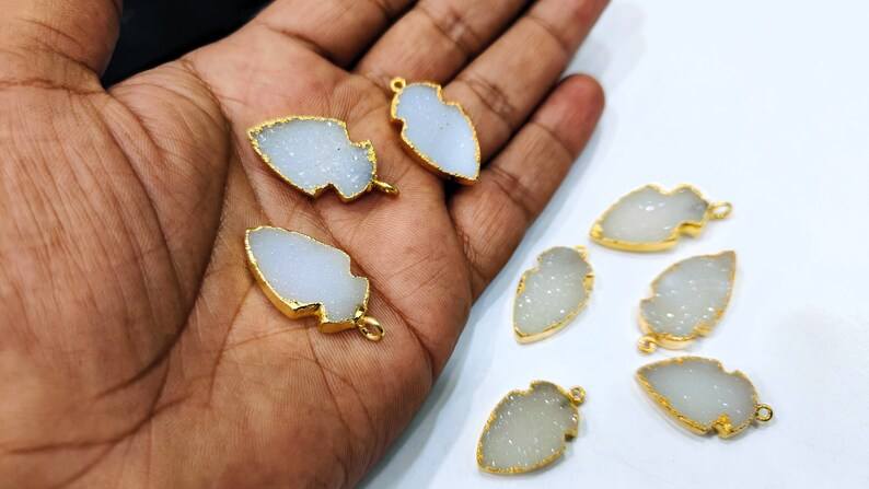 Natural White Druzy Gemstone Arrowhead Pendant 30x15mm Brass Cabochon Connectors with Single Loop Bezel for Jewelry Making