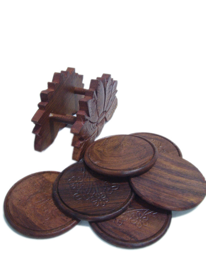 Natural Wood Color Oak Wooden Coaster Stand with Flower Design Hand Engraved Drink Coaster Holder for Home Kitchen Decoration