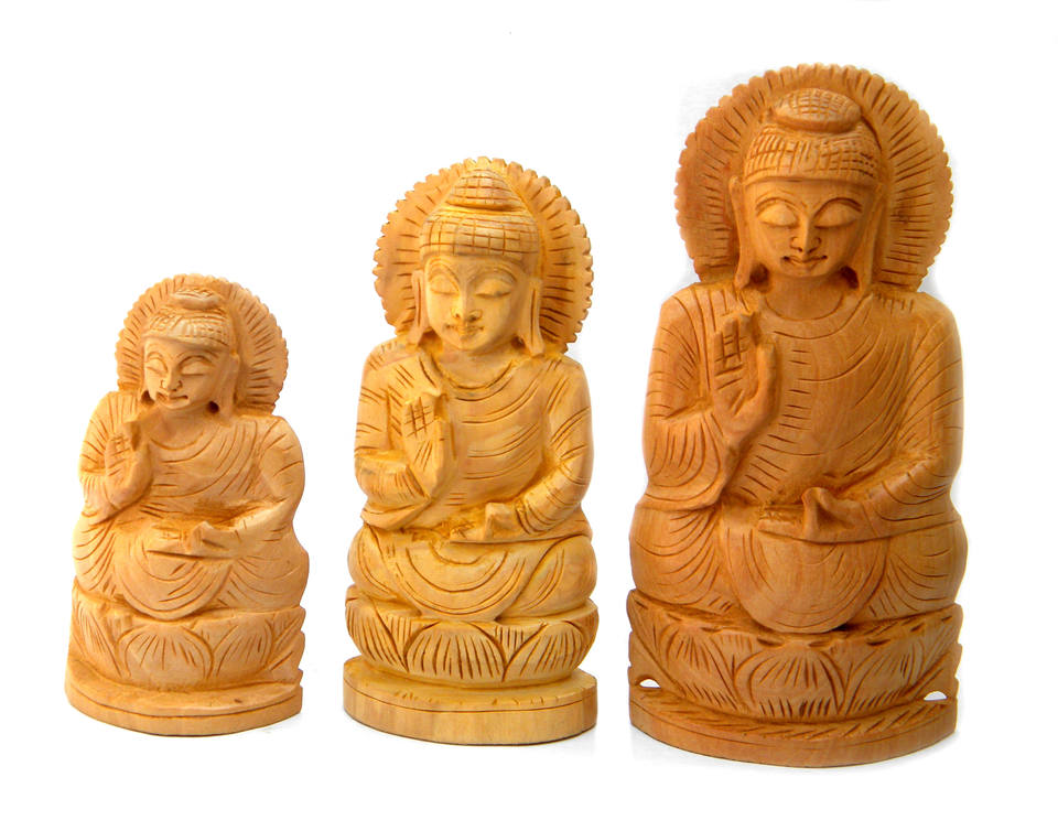 Natural Wood Fine Carved Buddha Handmade Indian Carved Wood Buddha Statue for Home and Room Decoration 3 Pcs Set Figurine Statue