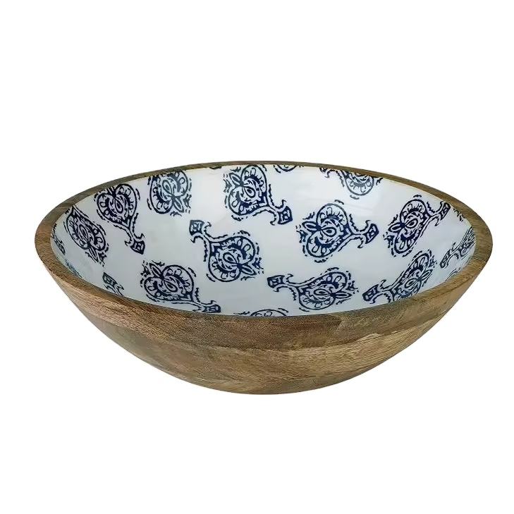 Natural Wooden Round Food Serving Bowl with Enamel Printed for Home & Restaurant Tabletop Dinnerware Serving Bowls